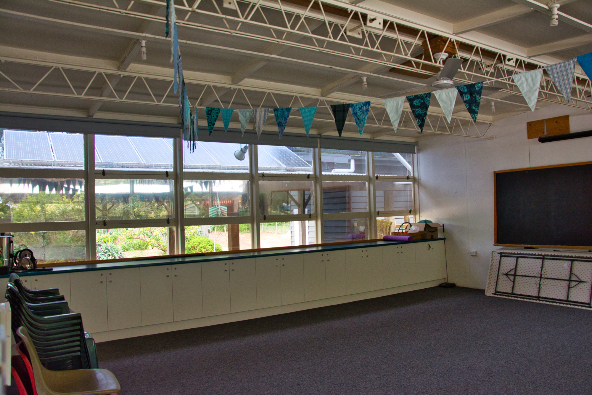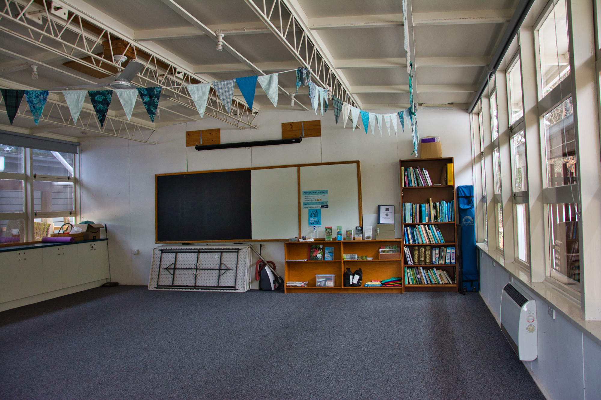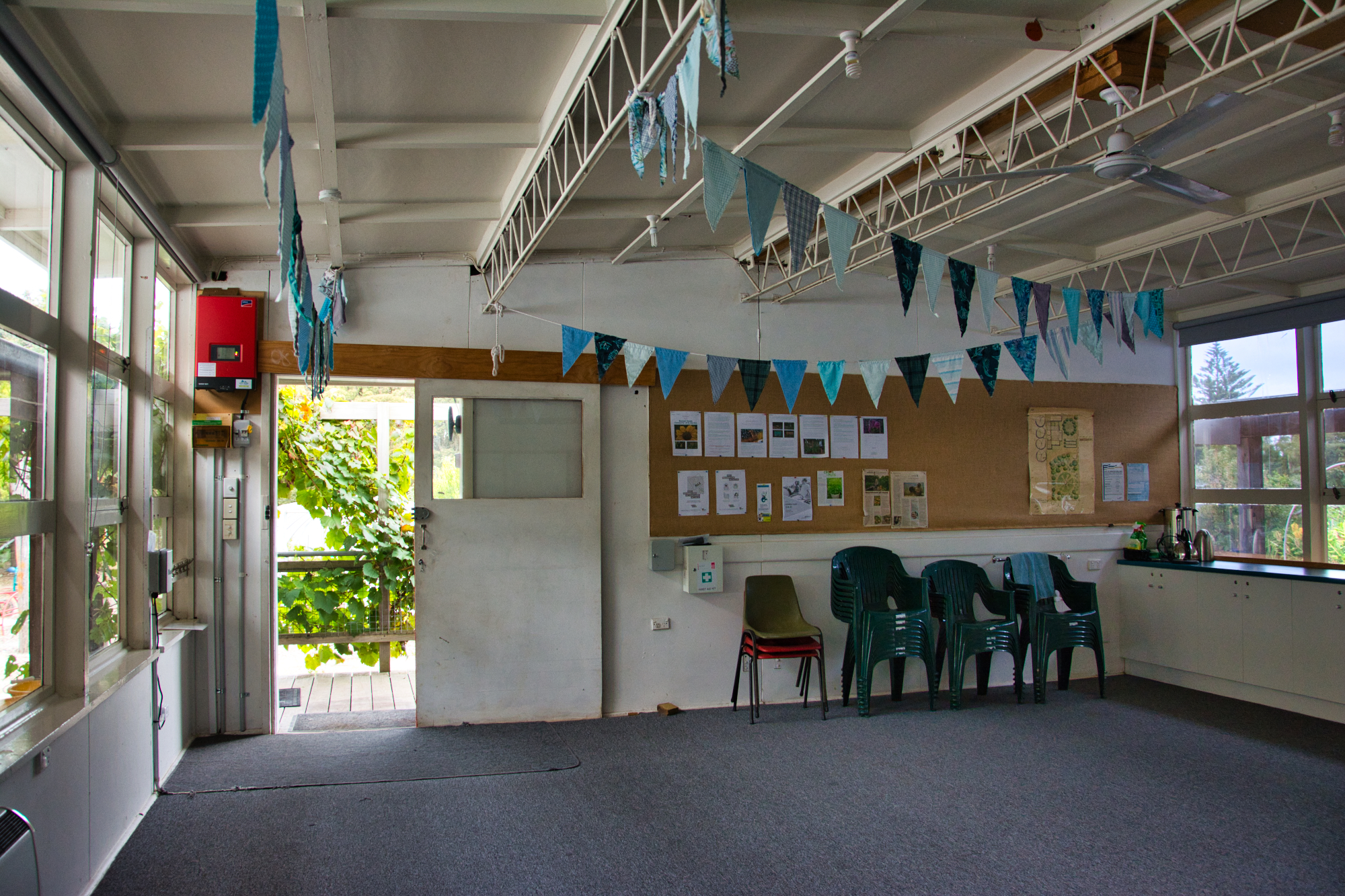 The Garden Room is approximately 50 square metres. Power is connected and water is non mains unfiltered tank water. The room is carpeted, has tables and chairs, storage cupboards, a notice board and black board and coffee and tea making capability.